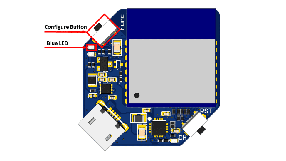 1- Ligue a placa Wio Node usando um cabo USB ou através da bateria. Pressione o botão de configuração por 4 segundos até que o LED azul fique aceso;