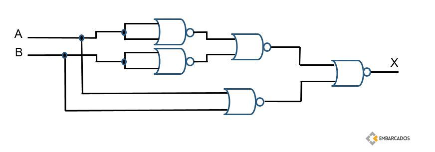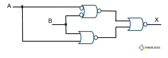 Uma porta inversora pode ser substituída, no entanto, por uma porta NOR com as entradas em curto. Então, finalmente obtemos o circuito para XOR com portas lógicas NOR.